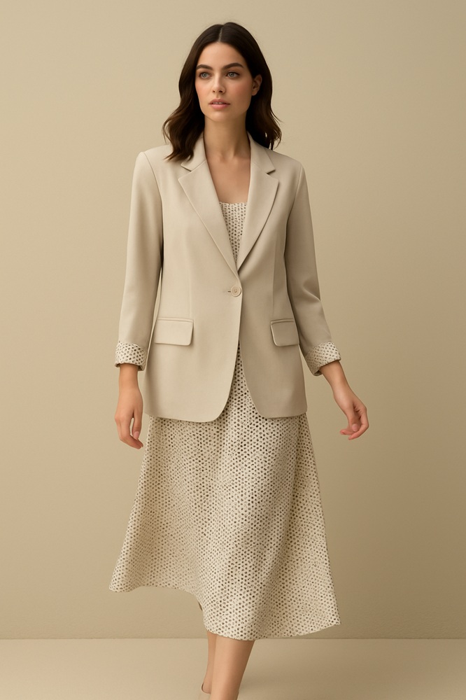 Η απαλή υφή του σατέν χαρίζει πολυτελή όψη και άνεση, ενώ το σακάκι προσθέτει ισορροπία και δομή στο look. Μπορεί να φορεθεί τόσο ως ολοκληρωμένο σύνολο όσο και χωριστά, προσφέροντας ευελιξία σε casual ή βραδινές περιστάσεις.