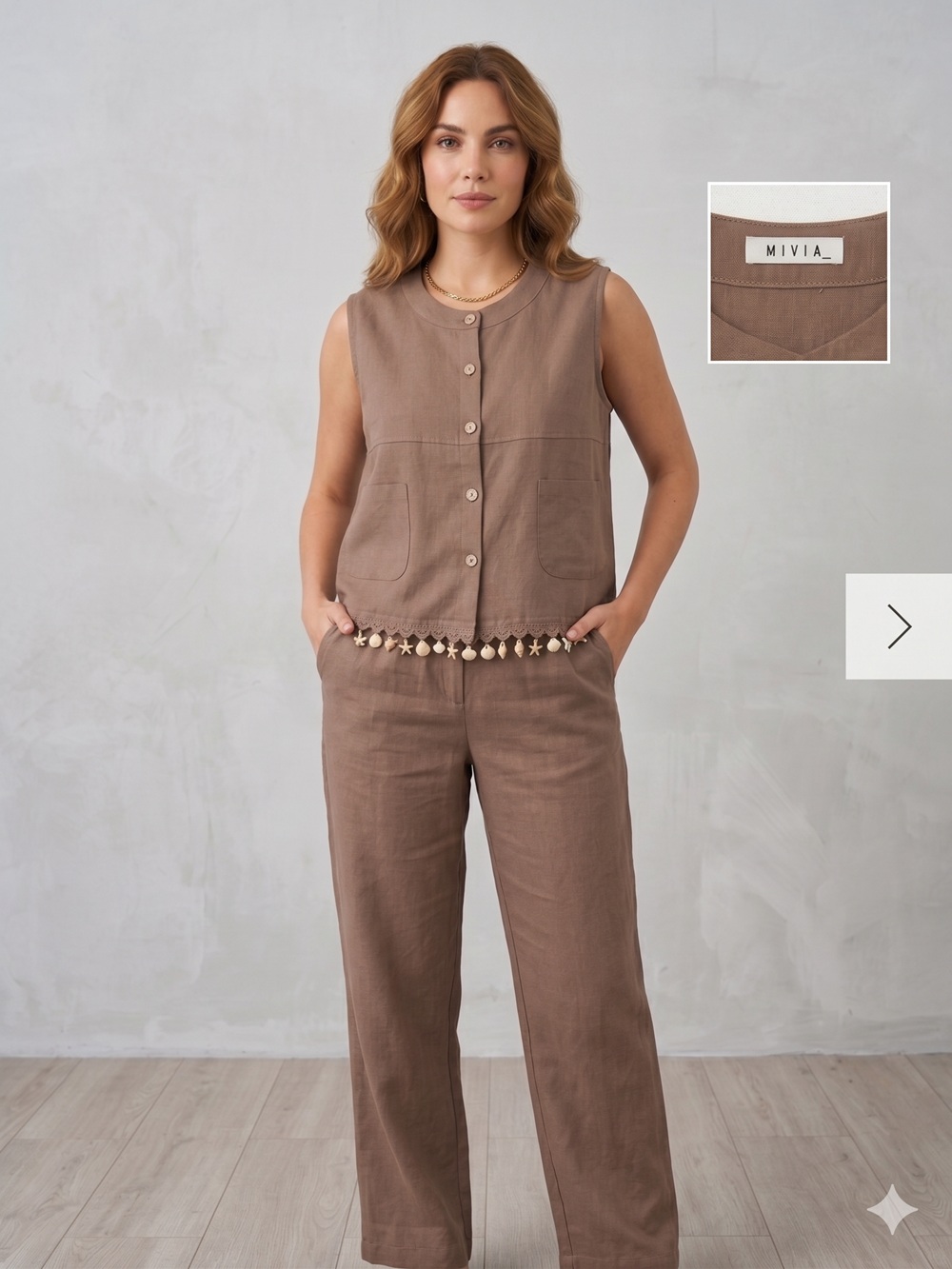 Το γυναικείο σετ λινό MIVIA είναι η ιδανική επιλογή για δροσερές και κομψές εμφανίσεις κατά τη διάρκεια της ημέρας. Το σετ αποτελείται από μπλούζα και παντελόνι, προσφέροντας άνεση, ευκολία στην κίνηση και σύγχρονο στυλ.